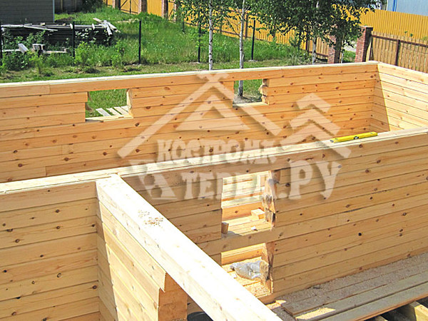 При устройстве перегородок из бруса используется сухой профилированный брус, как материал, дающий небольшую усадку и удобный в работе (из-за системы шип-паз, что обеспечивает высокую скорость возведения конструкции). Первый брус желательно положить на лагу.