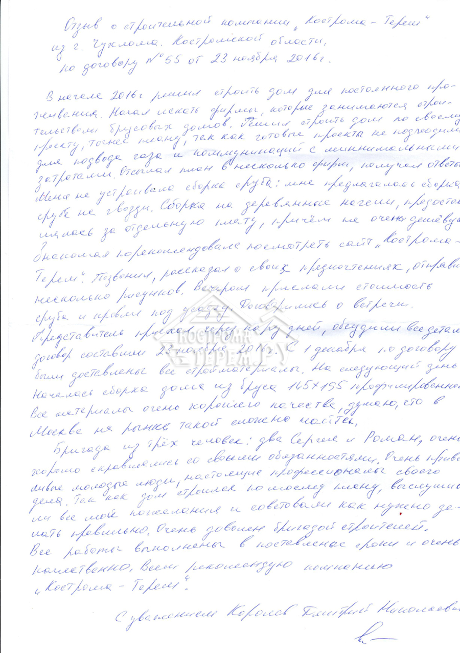 Отзыв о строительной компании "Кострома-Терем" из г. Чухлома, Костромской области по договору №55 от 23 ноября 2016г.