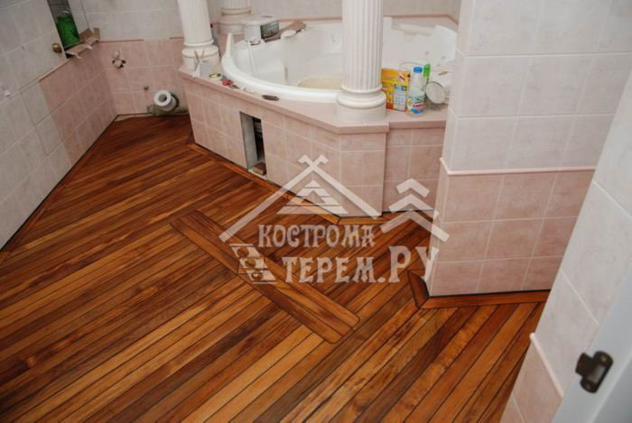 Начинать строительство ванной комнаты нужно с монтажа пола. Для ванных комнат лучшим вариантом будет бетонная стяжка, на которую укладывают плитку. Это наиболее дешевый и простой вариант. Таким же способом можно обустроить пол в других санузлах брусового дома. Еще один вариант — уложить на пол в санузле доски и листы гипсоволокна. Когда пол в ванной готов, можно начинать отделку стен. Для этого можно использовать практически любые достаточно влагостойкие материалы.