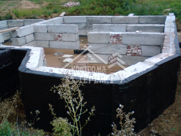 Если на вашем участке грунтовые воды проходят достаточно низко, и подвала в доме из бруса или бревна нет, в таком деревянном доме можно обойтись без гидроизоляции фундамента. В таких случаях для защиты стен дома от воздействия на них влаги используют специальную прокладку из гидроизоляционного материала. Такую прокладку устанавливают в стене деревянного дома, на высоте от 15 до 60 см от уровня почвы.